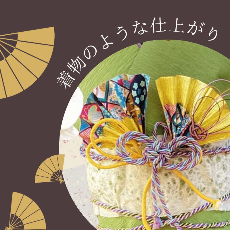 手作りの扇を2つお付けして、帯締めを模した紐を締めて着物風のラッピングです!